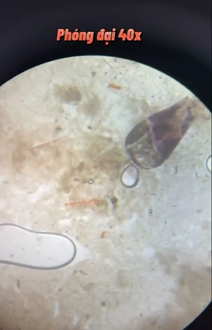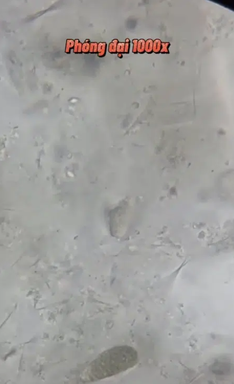 Ở mức phóng đại 40x, chủ yếu vẫn là xác tôm và vỏ tôm đã bị nghiền nát. Soi kỹ hơn một chút, chủ tài khoản phát hiện trong phần mắm tôm này có chứa xác kiến càng. Khi phóng đại 1000x thì kết quả cho thấy rất nhiều vi khuẩn đang bơi tưng bừng bên trong mắm tôm, đương nhiên, mắt thường không thể trông thấy được.