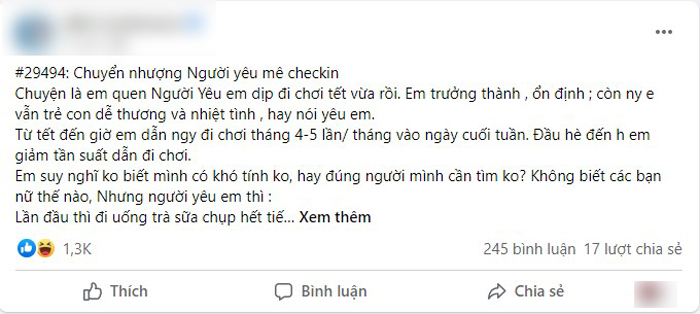 Theo chia sẻ của người bạn trai, cặp đôi quen nhau từ tết và thường đi chơi, hẹn hò với tần suất 4-5 lần/tháng vào ngày cuối tuần. Câu chuyện sẽ không có gì đáng nói cho đến khi anh chàng phát hiện ra người yêu mình bị nghiện chụp ảnh check in.