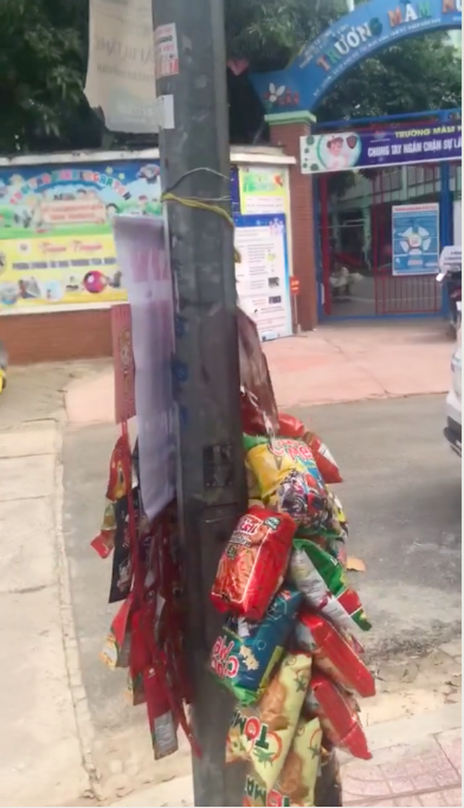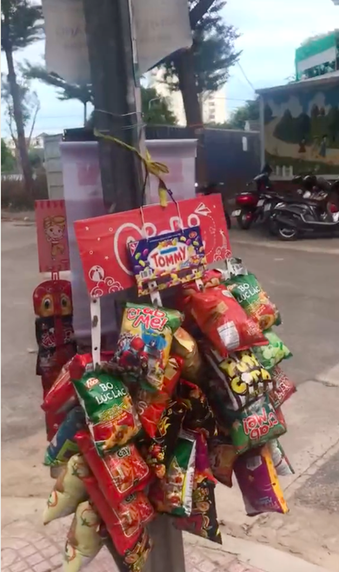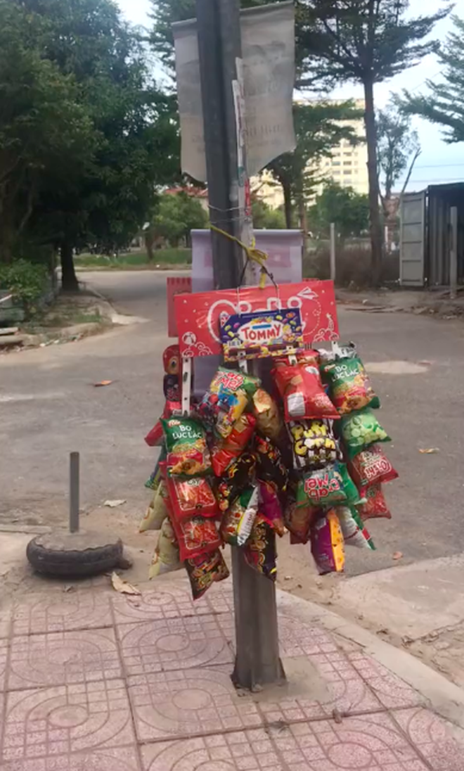 Theo đó, lúc dọn hàng, người phụ nữ này hồn nhiên đi về mà quên béng… 2 xâu bim bim treo trên cột điện. Đang đứng đợi con tan trường, ông bố này thấy buồn cười quá nên đã quay video lại.
