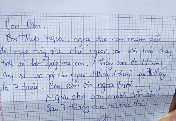 Mới đây cộng đồng mạng không khỏi thích thú trước bức thư cho thấy suy nghĩ chín chắn của cô bé tên C. (12 tuổi, ngụ quận 12, TP.HCM). Người nhận là bà ngoại C. nhưng điều đặc biệt là em viết thư không phải để xin tiền đi chơi, mua quà vặt, quần áo… mà muốn mượn tiền bà để mua máy tính: “Thưa ngoại, ngoại cho con mượn tiền để mua máy tính nhé ngoại. Con cần một cái máy tính để làm việc giúp mẹ con. 1 tháng con được 1 triệu, con sẽ trả góp cho ngoại”.