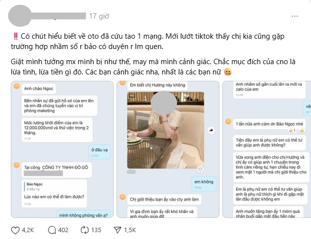 Câu chuyện được một chủ tài khoản Threads đăng tải đang thu hút lượng tương tác cao. Điều đáng chú ý là nhiều người chia sẻ đã từng rơi vào tình huống tương tự, có người bị lừa, có người vì cảnh giác cao, kịp thời phát hiện và thoát được bẫy của kẻ gian.