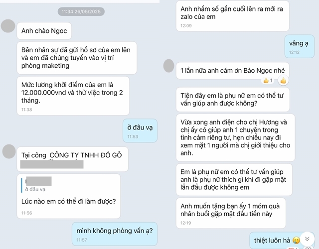 Theo đó, cô gái có tên viết tắt là N. chia sẻ loạt tin nhắn của cô và một người đàn ông lạ. Người này chủ động nhắn tin chúc mừng cô bạn đã trúng tuyển vị trí Marketing, mức lương khởi điểm 12 triệu đồng. Vì không hề có nhu cầu tìm kiếm việc làm hay gửi CV vị trí này trước đó nên N. đã ngay lập tức phủ nhận: “Mình không phỏng vấn”. Người đàn ông này sau đó đã thừa nhận nhắn nhầm số, song anh ta không kết thúc câu chuyện mà tiếp tục gợi ra một tình huống khác.