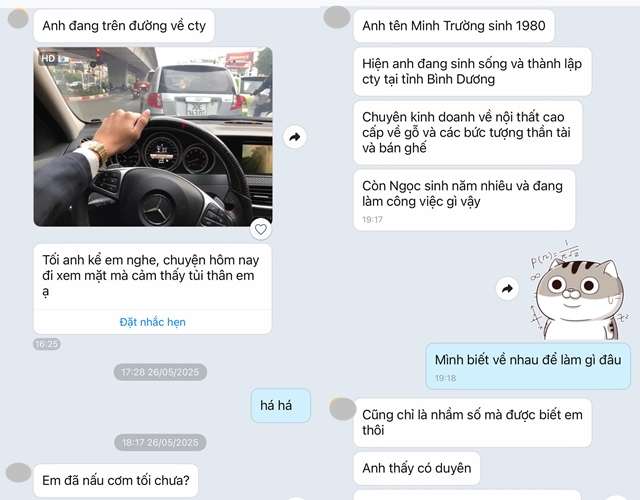 Thấy vậy, N. cũng nhiệt tình chia sẻ. Người đàn ông này tiếp tục “giữ mối quan hệ” với cô gái bằng cách kể những gì diễn ra tiếp theo sau buổi gặp mặt, đính kèm là hình ảnh xe hơi và liên tục hỏi han thông tin cá nhân của N..