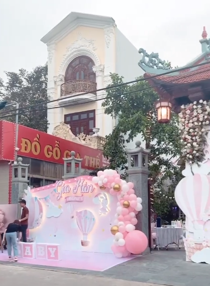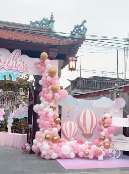 Đúng là rich kid sinh ra trong nhung lụa, con gái Thu Hương được ông bà bố mẹ tổ chức bữa tiệc đầu đời hoành tráng vô cùng. Sảnh đón tiếp khách mời tới dự tiệc to khổng lồ, trang trí theo phong cách hoàng gia, sắc hồng rợp kín cổng tòa lâu đài nơi gia đình Thu Hương đang sống. Lối vào bên trong cũng rực rỡ đèn hoa, xếp đầy bàn tiệc 2 bên. Tuy không có ảnh cận cảnh bàn tiệc nhưng ai cũng đoán chỉ toàn sơn hào hải vị, chẳng thua kém tiệc cưới cách đây hơn 1 năm của vợ chồng nàng tiểu thư siêu giàu.