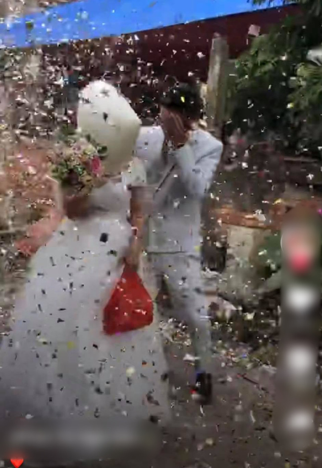 Theo đó, đám bạn đã dùng rất nhiều pháo giấy, nhắm thẳng mặt cô dâu chú rể và bắn. Cô dâu vội dùng nón che mặt, chú rể chỉ che được bằng tay nên trúng khá nhiều, vội quay ra sau cúi gập người xuống.