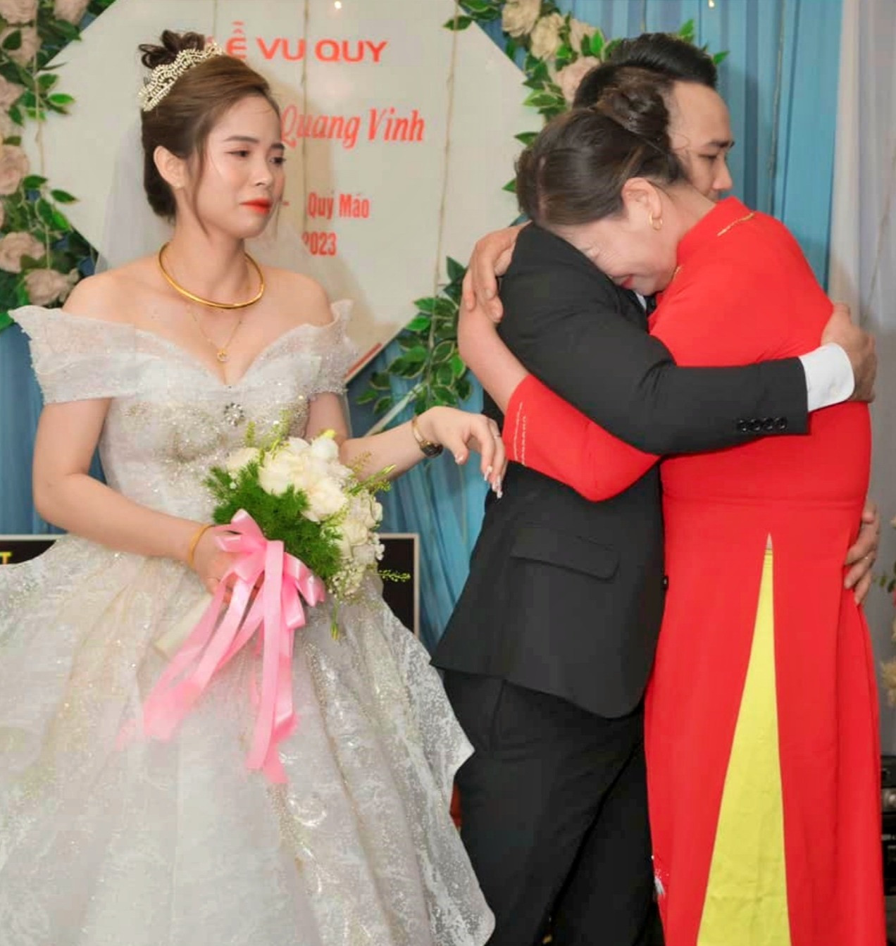 Giây phút xúc động, bà Đặng Thị Hòa (64 tuổi), mẹ chồng chị An ghé sát tai con dâu và nói: “Con gái mẹ phải sống thật hạnh phúc nhé!”.