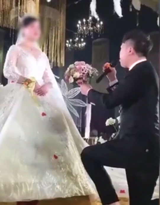 Theo đó, hôn lễ được tổ chức tại một khách sạn rất long trọng. Trước sự chứng kiến của hàng trăm quan khách, bạn bè, người thân, chú rể quỳ gối, trên tay cầm bó hoa và hét lớn "gả cho anh nhé". Những tưởng viễn cảnh tiếp đó của cặp đôi sẽ là khoảnh khắc ngọt ngào khi cô dâu thẹn thùng nói lời đồng ý và cả hai trao nhau nụ hôn nồng cháy. Nhưng thực tế lại khác xa.