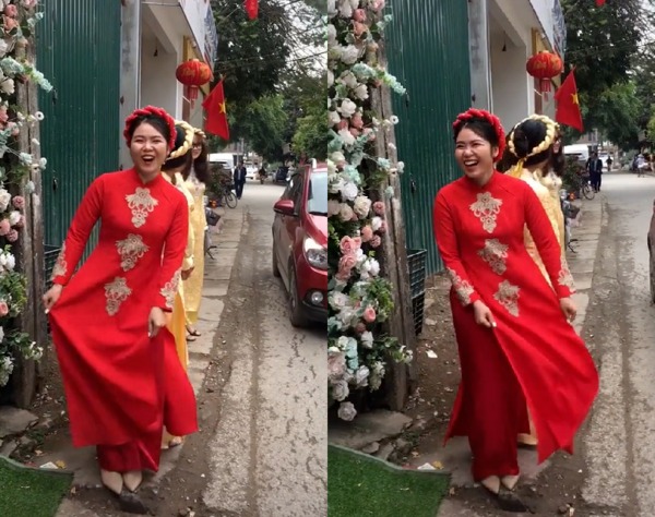 Theo đoạn clip, cô dâu diện một chiếc áo dài đỏ truyền thống rực rỡ, đứng nhún nhảy cười thật tươi và hét lớn "bố mẹ ơi con lấy được chồng rồi". Hành động của nàng dâu mới khiến cả rạp cưới được một trận cười nghiêng ngả, đến các bậc phụ huynh cũng không nhịn được mà bật cười trước vẻ hài hước và hớn hở của cô nàng.