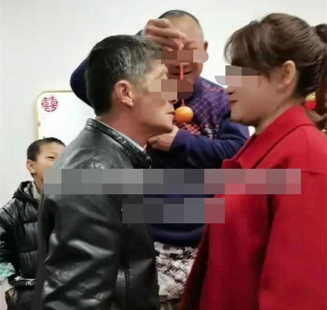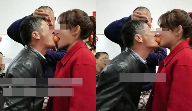 Những vị khách tham dự đám cưới đã tổ chức trò chơi cắn quả cam nhưng người tham gia không phải cô dâu và chú rể, mà lại là cô dâu với bố chồng, ông Tập Công Công.