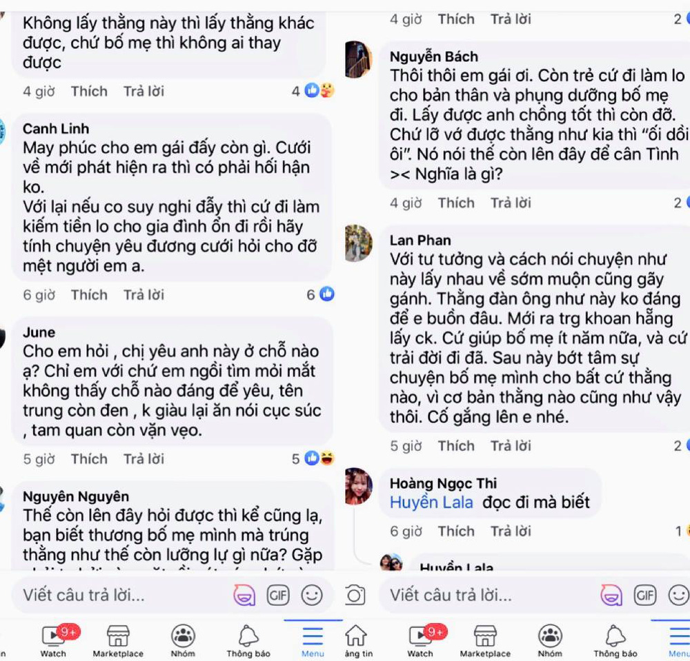 Tuy nhiên, bất ngờ thay, nếu như nữ chính đang cảm thấy đau khổ, chán nản thì dân mạng lại gửi lời chúc mừng cô sau cuộc cãi vã này. Hội chị em cho rằng N.H đã may mắn vì nhận ra bản tính ích kỷ, hẹp hòi của bạn trai sớm, nếu không sẽ hối không kịp vì cưới nhầm chồng.