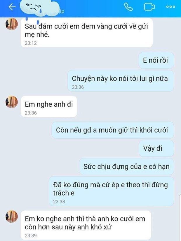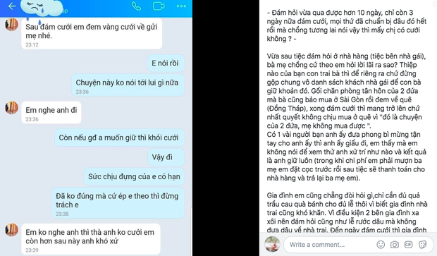Cô nàng này viết: "Đám hỏi vừa qua được hơn 10 ngày, chỉ còn 3 ngày nữa đám cưới, mọi thứ đã chuẩn bị đâu đó hết rồi mà chồng tương lai nói vậy thì mấy chị có cưới không?