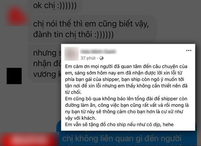 "Em cảm ơn mọi người đã quan tâm đến câu chuyện của em, sáng sớm hôm nay em đã nhận được lời xin lỗi từ phía bạn gái của shipper, bạn ship còn ngỏ ý muối tới tận nơi để xin lỗi nhưng em thấy không cần thiết nên đã từ chối.