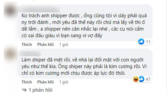 Em cũng bỏ qua không báo lên tổng đài để shipper còn đường làm ăn. Công việc bạn cũng rất vất vả rồi, mong là người yêu bạn từ nay sẽ thông cảm cho bạn hơn là cư xử như vậy với khách.