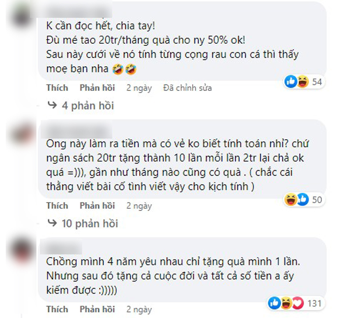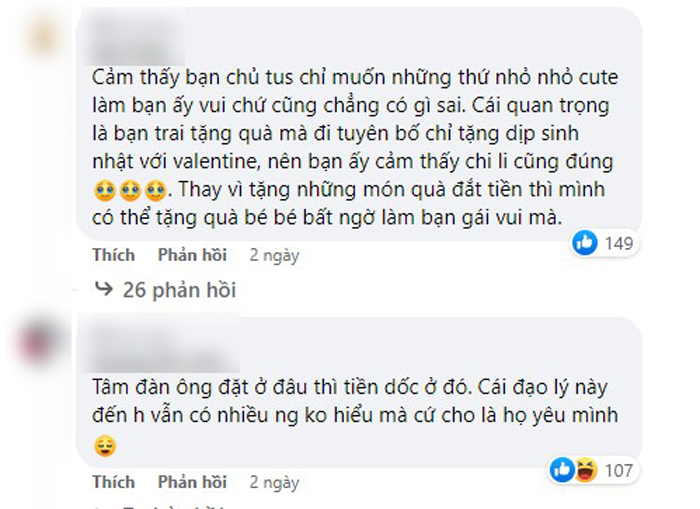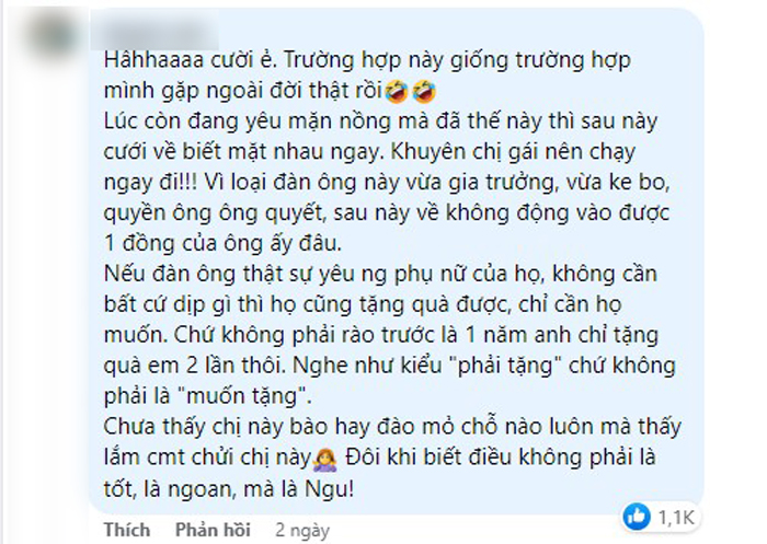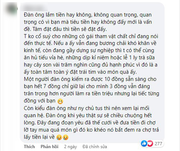 Tâm sự của cô gái đã nhanh chóng thu hút chú ý của cư dân mạng, có rất nhiều tranh cãi trái chiều. Một số ý kiến cho rằng việc tặng quà là tự nguyện, anh người yêu kể cả có nhiều tiền nhưng cũng chẳng có nghĩa vụ phải đáp ứng cô.