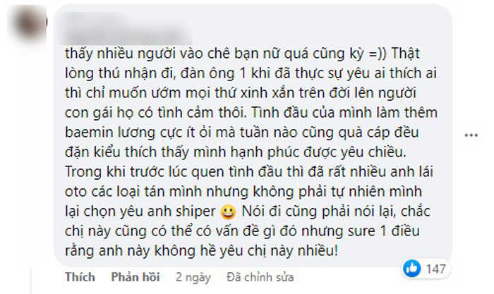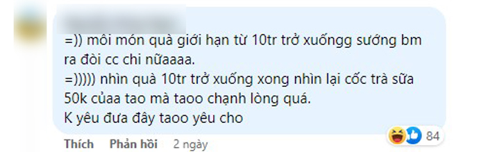 Mình chỉ chạnh lòng mỗi đoạn anh hơi dè xẻn về mặt quà cáp. A tuyên bố 1 năm chỉ tặng quà đúng 2 dịp vào đợt sinh nhật mình và Valentine, mỗi món giới hạn từ 10 triệu đổ xuống.