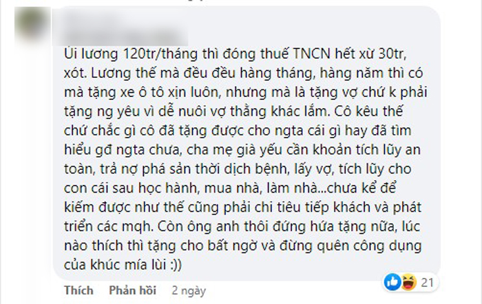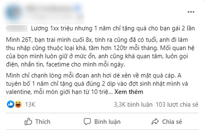 03/06/2022 17:15Cô gái buồn rầu vì bạn trai lương 120 triệu nhưng một năm tặng quà có 2 lần, dân tình ngán ngẩm: 'Lấy nhau về mua cọng hành cũng phải xin ý kiến'