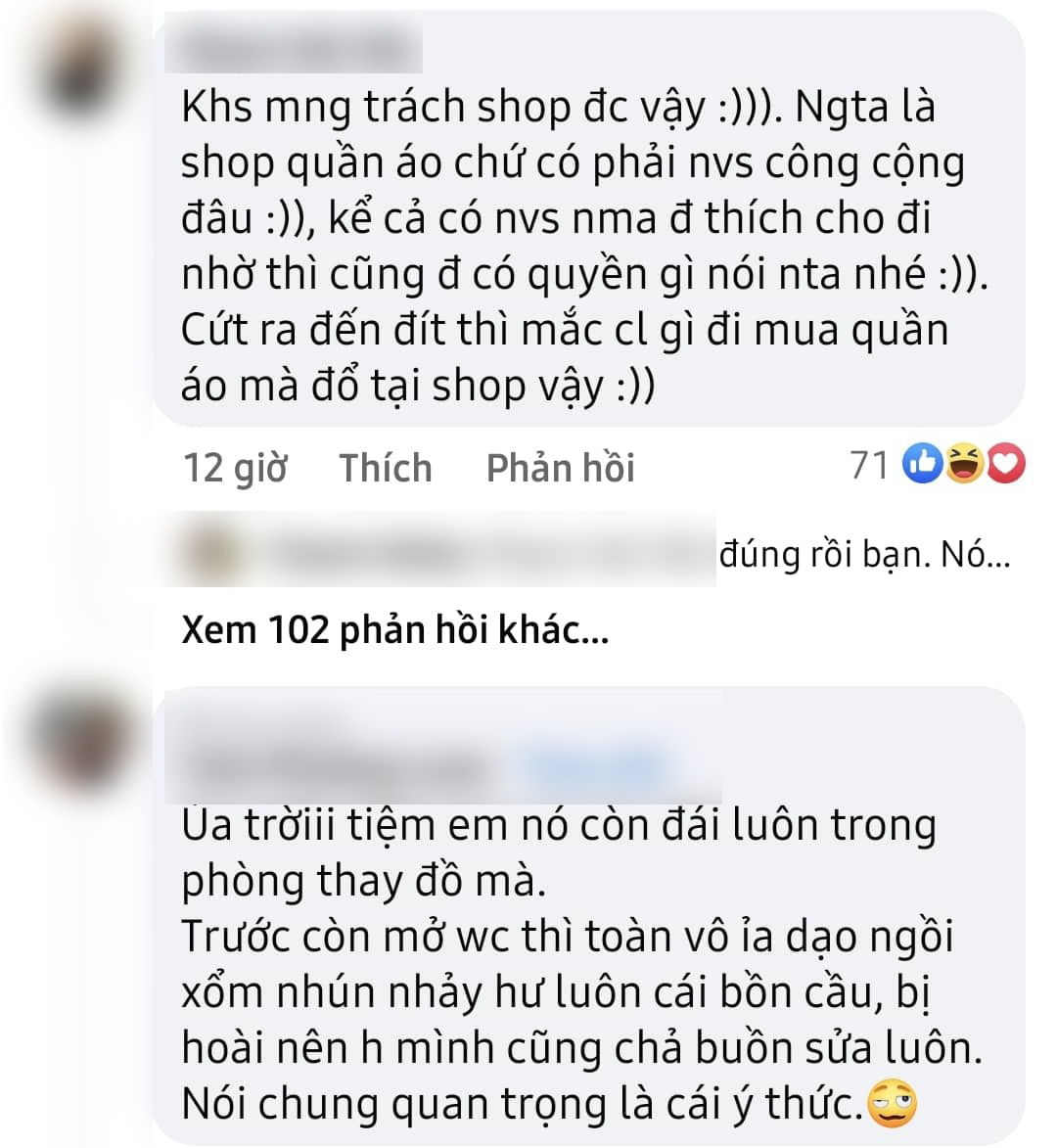 Câu hỏi trên quả thực rất khó trả lời, đọc xong màn bóc phốt cặp đôi này, cư dân mạng đã để lại rất nhiều bình luận gây tranh cãi. Người thì trách móc vấn đề ban đầu ở ngay việc chủ shop không chịu cho người ta đi vệ sinh nhờ nên mới xảy ra cơ sự này, người thì lại thông cảm cho chủ shop vì gặp phải một vị khách vô ý thức.