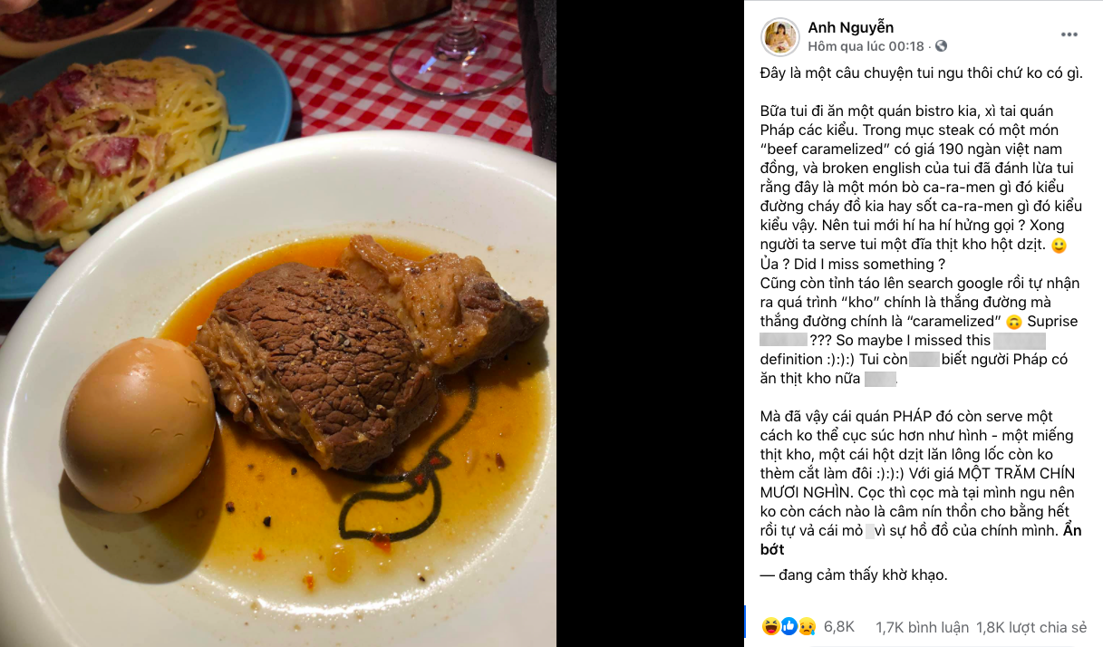 Bữa tui đi ăn một quán bistro kia, style Pháp các kiểu. Trong mục steak có một món tên 'beef caramelized' với giá 190 ngàn, và vốn tiếng Anh hạn hẹp của tui đã đánh lừa tui rằng đây là một món bò ca-ra-men kiểu đường cháy, hay sốt ca-ra-men gì đó? Thế nên tui mới hí ha hí hửng gọi ra. Xong rồi người ta phục vụ tui một đĩa thịt kho hột vịt. Ủa? Bộ tui có vấn đề về đọc hiểu ư?