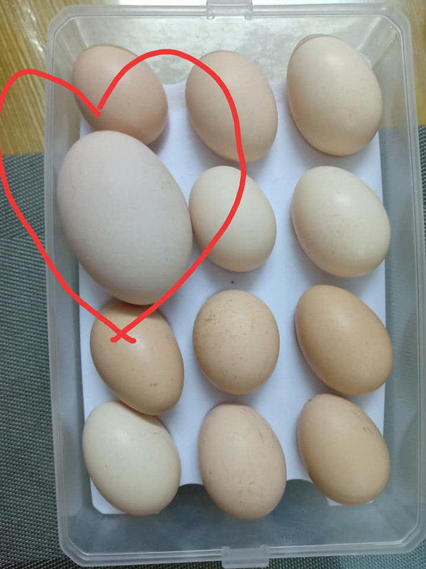 Kèm theo bài đăng của cô gái là hình ảnh về quả trứng đặc biệt. Quả trứng gà này bỗng to đột biến, gần gấp đôi những quả trứng bên cạnh khi cùng một gà mẹ đẻ ra.