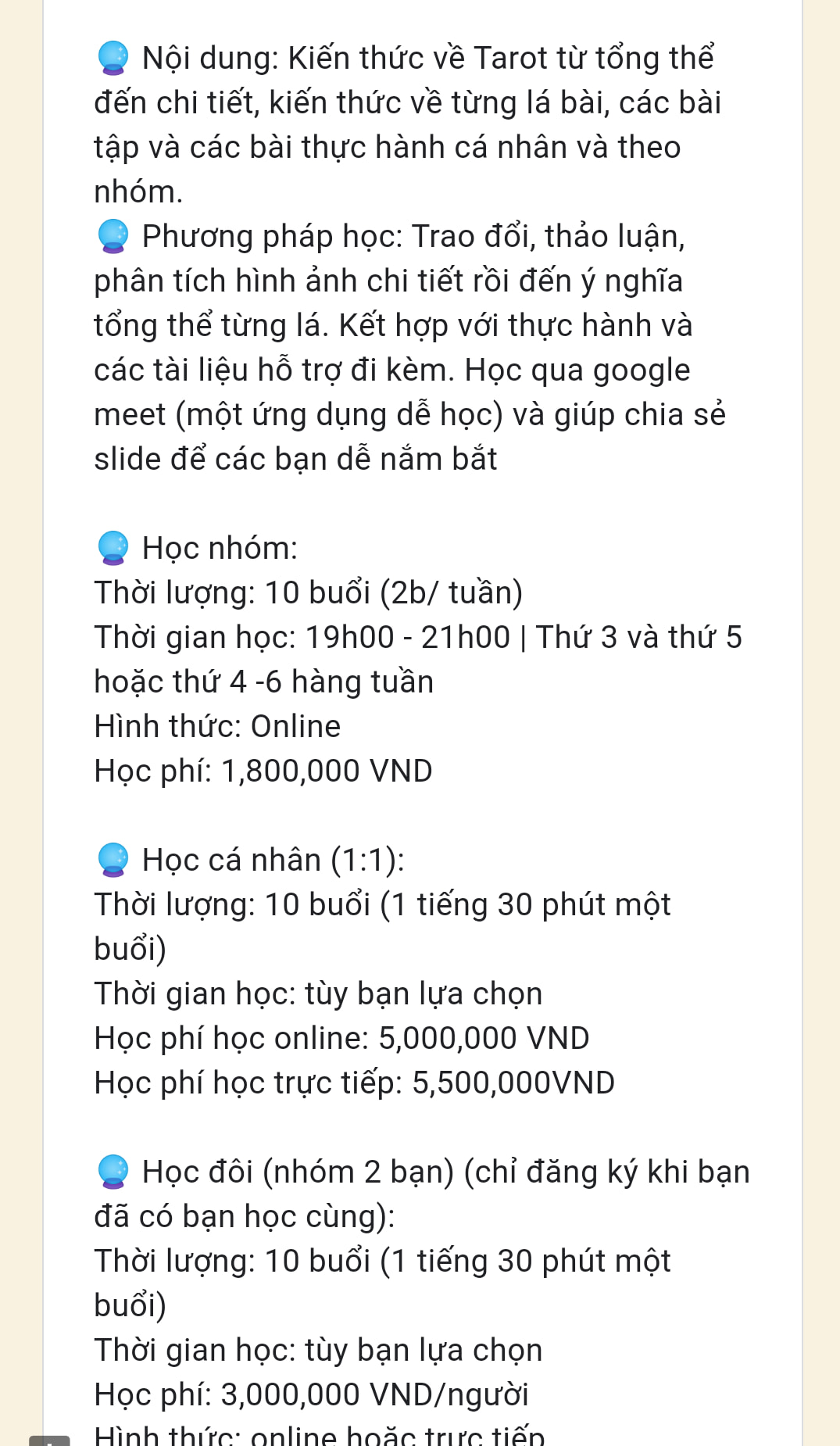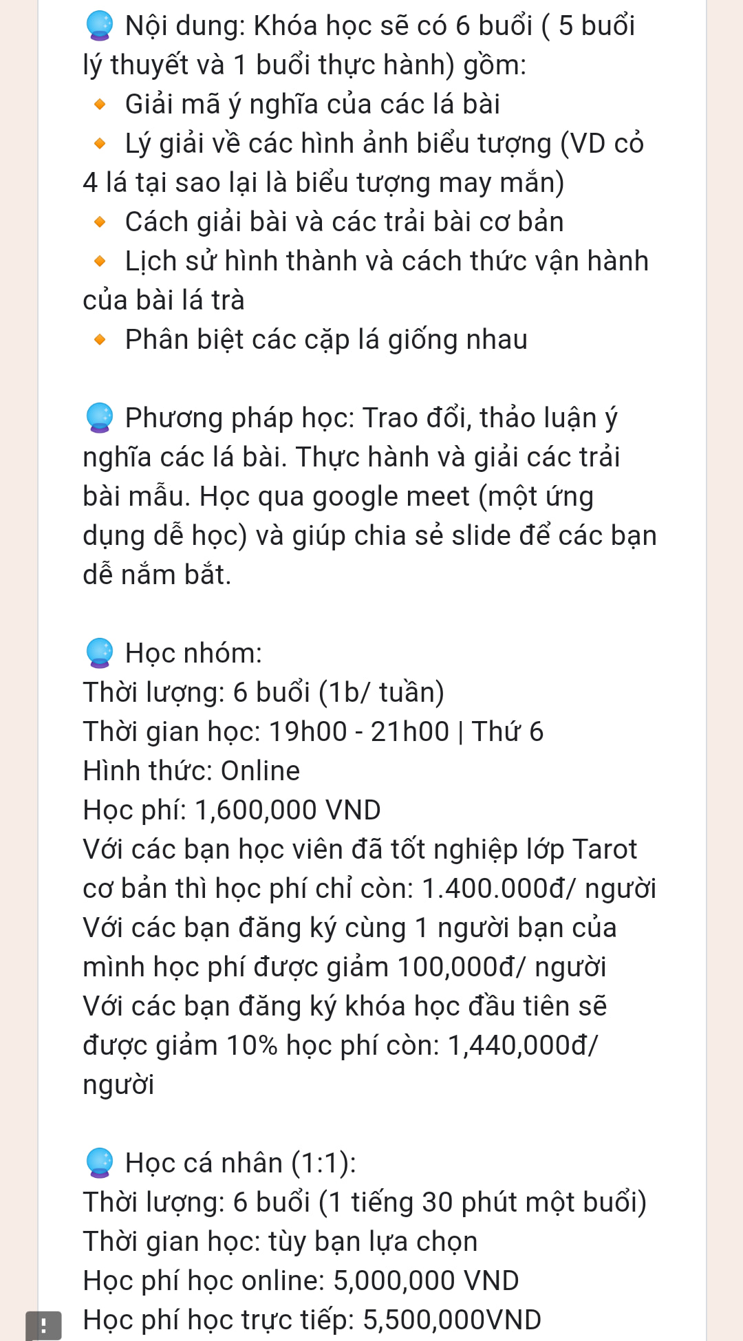 "Đây là những thông tin mình tổng hợp được của N. (tên viết tắt) và nó được tiết lộ bởi học viên cũ của bạn này. Dạy tarot lấy kiến thức trên mạng rồi đem về xào nấu lại, không có trải bài cụ thể cho học viên khi theo học, cam kết hỗ trợ học viên mà khi học viên gửi ảnh trải bài trong nhóm chat "dành cho học viên" thì không thấy giải.