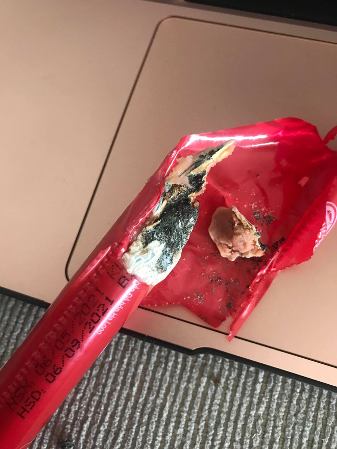 Đến cái thứ 2 do bận làm nên bóc ra ăn luôn, không nhìn nên cắn một phát mình đã phải nhổ ra ngay lập tức vì vị lạ, quá kinh khủng. Lúc nhìn xuống thì thấy thân cây xúc xích bị mốc lớn, chuyển thành màu đen trắng".