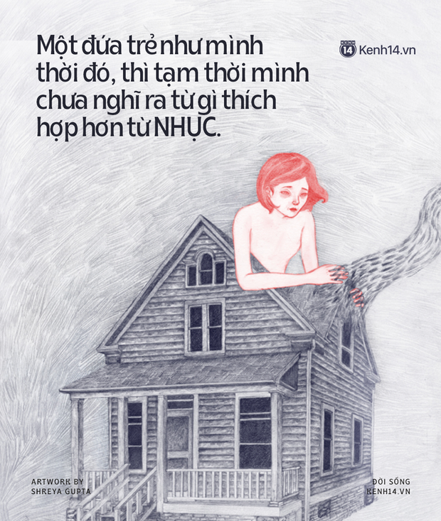 Hồi tiểu học, trường mình thường tổ chức cho các học sinh quét rác vào sáng sớm. Mình chưa một lần nào đến được, vì mẹ mình không muốn để mình dậy sớm. Mọi người có hiểu cảm giác là người duy nhất bị đứng dậy phê bình giữa lớp vì không đi quét sân không? Có lẽ giờ nghĩ lại thì nó không là gì cả, nhưng với 1 đứa trẻ như mình thời đó, thì tạm thời mình chưa nghĩ ra từ gì thích hợp hơn từ NHỤC. Và khi mình nói, mẹ mình vẫn gạt đi, làm theo ý mẹ, như mọi lần…".