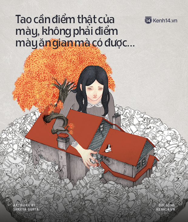 "Bị chửi vì điểm kém là chuyện thường rồi, bị chửi vì điểm cao mới sợ cơ. Mới tuần trước thôi, mình được 10 điểm Toán. Phải, mình giải được câu C bài hình. Mình học không giỏi, cũng tầm cỡ trung bình thôi, nhưng mình đã nỗ lực rất nhiều, rất nhiều để làm cho ba mẹ mình tự hào. Nhưng sau khi mang điểm 10 về nhà khoe, mẹ đã chửi, đánh mình, mẹ bảo: 'Tao cần điểm thật của mày, không phải điểm mày ăn gian mà có được...'.