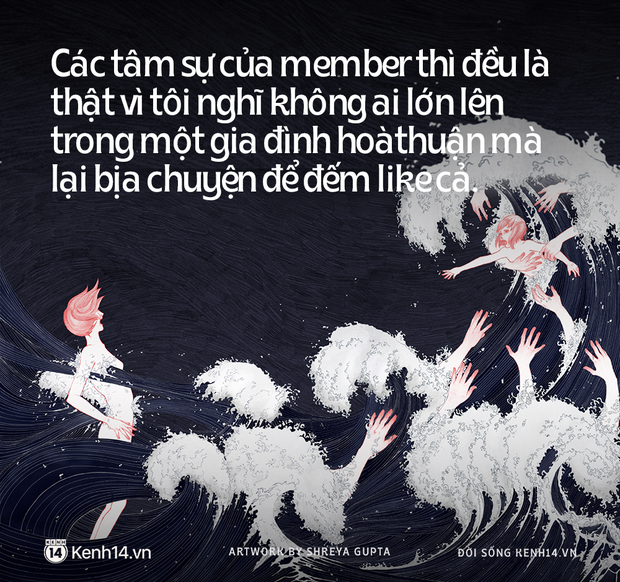 Đội ngũ admin chỉ làm ảnh chế từ trải nghiệm của bản thân và nguồn nước ngoài chứ không chia sẻ nhiều. Các tâm sự của member thì đều là thật vì tôi nghĩ không ai lớn lên trong một gia đình hoà thuận mà lại bịa chuyện để đếm like cả.