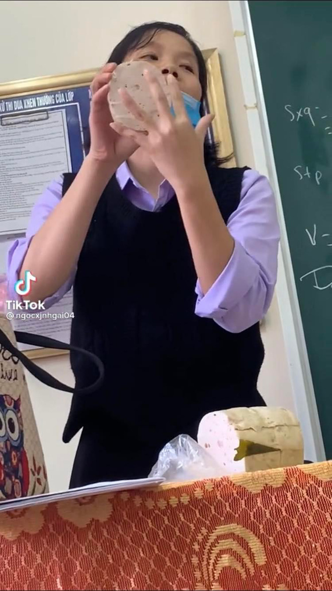 Theo đó, trong tiết học về hình trụ, cô giáo giới thiệu về các khái niệm cơ bản để học sinh hiểu được vấn đề, song dường như muốn bài học được đơn giản hóa nhưng lại không có gì xung quanh phù hợp để làm ví dụ, nữ giáo viên này đã lấy hẳn một khoanh giò chả ra. Và bất đắc dĩ, nó đã thành giáo cụ để cô giáo giảng bài.