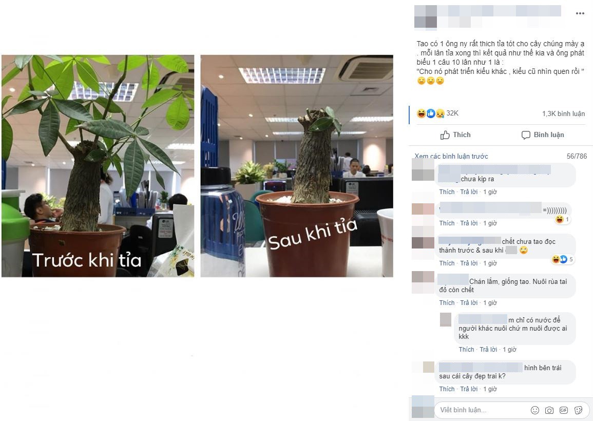 Trong ảnh kèm theo, D.T.X đã khiến dân mạng được phen cười lăn lóc khi nhìn thấy chậu cây cảnh trước và sau khi tỉa. Nếu như trước khi được chủ nhân đụng vào, cái cây trông vô cùng xinh xắn với cành lá xanh mát thì chỉ sau một lần "dao kéo", cái cây tội nghiệp lại trở nên trọc lóc vì chẳng còn bất cứ 1 chiếc cành hay lá nào mà chỉ trơ trơ mỗi gốc.