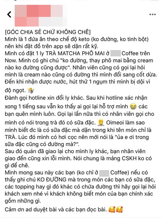 Sự việc trở nên ồn ào khi nhân viên cho biết trong trà cũng pha sữa đặc có đường. Là người đang áp dụng chế độ ăn keto, cô gái đã vô cùng khó chịu vô cùng và lên mạng biên một chiếc status với tiêu đề khá khó hiểu: "Góc chia sẻ chứ không chê".
