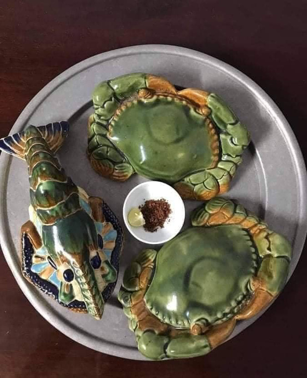 Hoá ra, những con cua biển và tôm hùm đầy ắp mâm kia thực chất là tượng gốm được tạo hình khéo léo. Kích cỡ to cũng ngang ngửa cua - tôm thật, điểm khác biệt nhất có lẽ là màu xanh lá cây đậm.