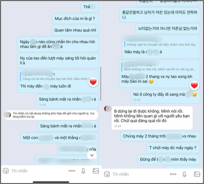 "Hai tháng qua chúng nó ngang nhiên quan tâm nhau, nói chuyện còn nhiều hơn nói với người yêu. Hỏi han các kiểu đủ thứ, mình mới chửi nó được 2 ngày nó đã kêu. Người yêu tao mà ngày nào sáng tối cũng hỏi han. Ngày nào cũng nhắn tin, sáng đi làm nhắn, không ngủ được nhắn, ăn trưa nhắn, ăn gì nhắn, rảnh nhắn, ngủ dậy nhắn, nằm trên giường chưa dậy nhắn, tối nhắn, đi ngủ nhắn, đêm nhắn…