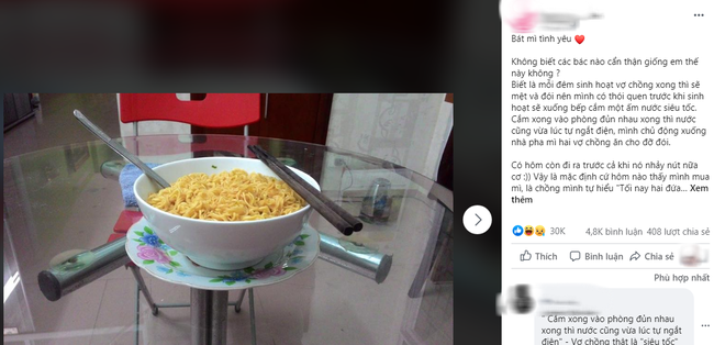 Kèm theo lời tâm sự trải lòng là hình ảnh "bát mì tình yêu" của cô vợ trẻ. Tuy nhiên, câu chuyện này lại thu hút sự chú ý của dân mạng vì một điều khác: