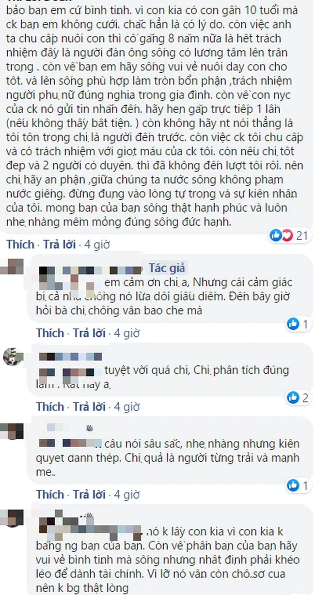 Trong 1 loạt những bình luận khuyên bỏ chồng, một người phụ nữ đưa ra lời tư vấn: "Bảo bạn em cứ bình tĩnh. Vì đối phương có con gần 10 tuổi mà chồng bạn em không cưới, chắc hẳn là có lý do. Còn việc anh ta chu cấp nuôi con thì cố gắng 8 năm nữa là hết trách nhiệm, đấy là người đàn ông sống có lương tâm nên trân trọng. Còn về bạn em hãy sống vui vẻ nuôi dạy con cho tốt. Và nên sống phù hợp, làm tròn bổn phận, trách nhiệm người phụ nữ đúng nghĩa trong gia đình. Còn về người yêu cũ của chồng nó gửi tin nhắn đến, hãy hẹn gặp trực tiếp 1 lần (nếu không thấy bất tiện), còn không hãy nhắn tin nói thẳng là: 'Tôi tôn trọng chị là người đến trước, còn việc chồng tôi chu cấp và có trách nhiệm với giọt máu là việc của chồng tôi. Nếu chị tốt đẹp và 2 người có duyên thì đã không đến lượt tôi rồi. Nên chị hãy an phận, giữa chúng ta nước sông không phạm nước giếng, đừng đụng vào lòng tự trọng và sự kiên nhẫn của tôi'. Mong bạn của bạn sống thật hạnh phúc và luôn nhẹ nhàng mềm mỏng đúng đức hạnh".