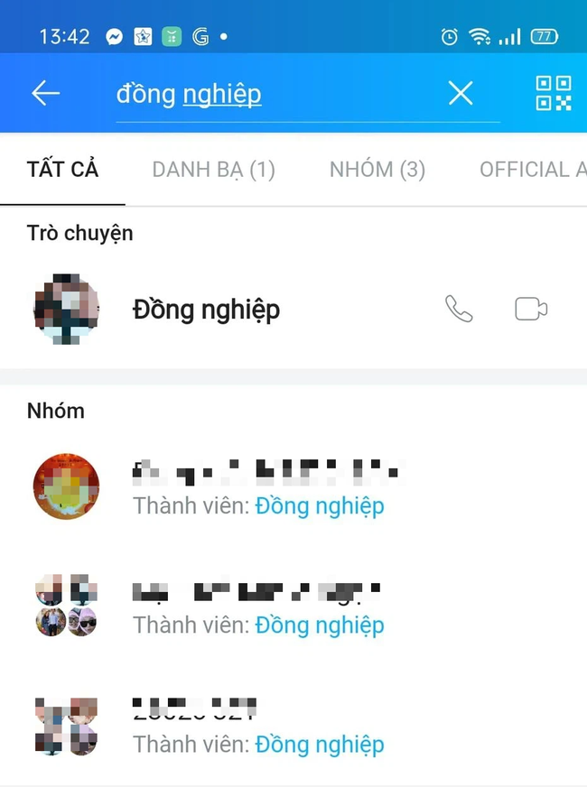 Chỉ cần gõ "đồng nghiệp" là phần tin nhắn của người đã ẩn sẽ hiện ra cùng các nhóm có người này tham gia.
