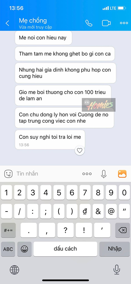 "Mẹ nói con hiểu này, thâm tâm mẹ không ghét bỏ gì con cả nhưng hai gia đình không phù hợp con cũng hiểu. Giờ mẹ bồi thường cho con 100 triệu để làm ăn. Con chủ động ly hôn với Cuong để nó tập trung vào công việc con nhé. Con suy nghĩ tối trả lời mẹ".