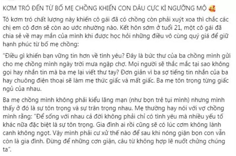 Mới đây, một cô gái 21 tuổi đã chia sẻ về may mắn của bản thân khi được học hỏi những điều vô cùng quý giá để giữ hạnh phúc từ bố mẹ chồng.
