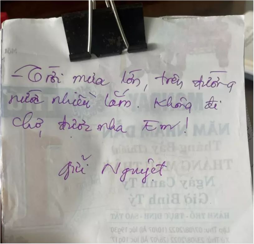 “Trời mưa lớn, trên đường nước nhiều lắm. Không đi chợ được nha Em. Gửi Nguyệt!”. Những ai tinh ý hơn còn nhận ra rằng ngoài giọng điệu vô cùng dịu dàng, chữ “Em” cũng được bác trai viết hoa một cách đầy trân trọng.