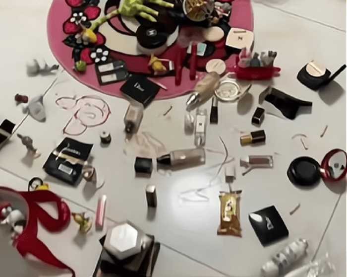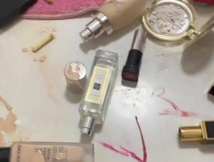 Chị lập tức chụp ảnh và quay video “bãi chiến trường” lại để gửi cho người thân. Đoạn clip cho thấy, mỹ phẩm của chị nằm lăn lóc khắp trên sàn nhà. Những hộp phấn đắt tiền bị đục khoét lởm chởm, son được dùng như cọ vẽ, chà lên sàn nhà. Không chỉ vậy, lũ trẻ còn mang snack vào phòng của chị ăn, nên mỹ phẩm của chị bị trộn lẫn với vụn bánh.