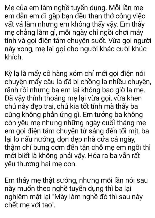 Em tưởng ba không còn yêu mẹ nhưng những ngày cuối tháng, mẹ em gọi điện tám chuyện từ sáng đến tối mịt, ba lại lo nấu nướng, dọn dẹp nhà cửa cả ngày, thậm chí bưng cơm đến tận chỗ mẹ em ngồi thì mới biết là không phải vậy. Hoá ra, ba vẫn rất yêu thương hai mẹ con".