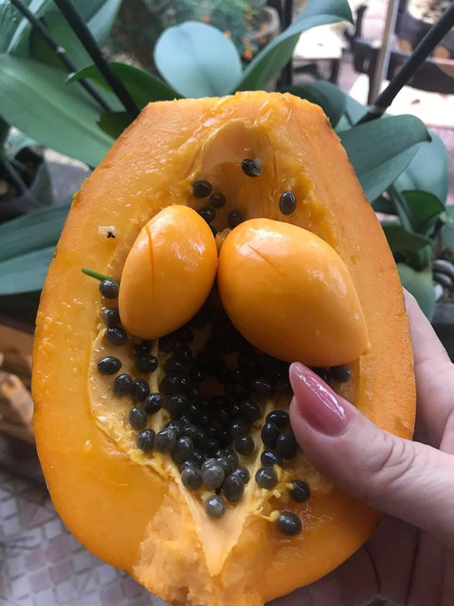 Dù bên ngoài giống như bao quả đu đủ khác nhưng đến khi bổ đôi ra, ai nấy đều ngỡ ngàng khi thấy bên trong quả đu đủ này còn có 2 quả nhỏ khác, khiến mọi người phải trêu là đu đủ có bầu.