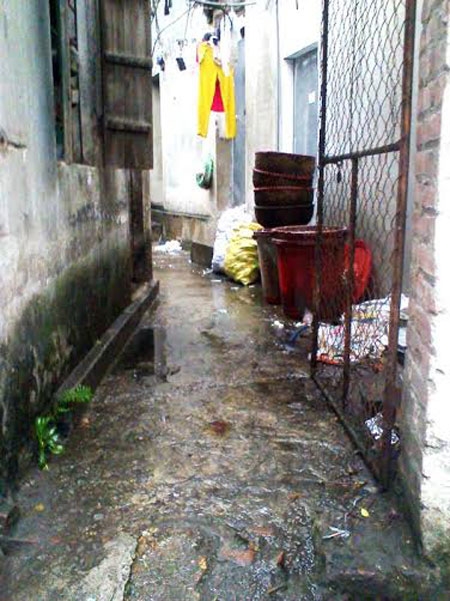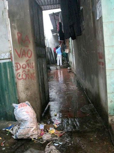 Lối vào nhà trọ công nhân nhỏ hẹp, sâu hun hút, ẩm ướt, lầy lội bùn đất và rác thải |