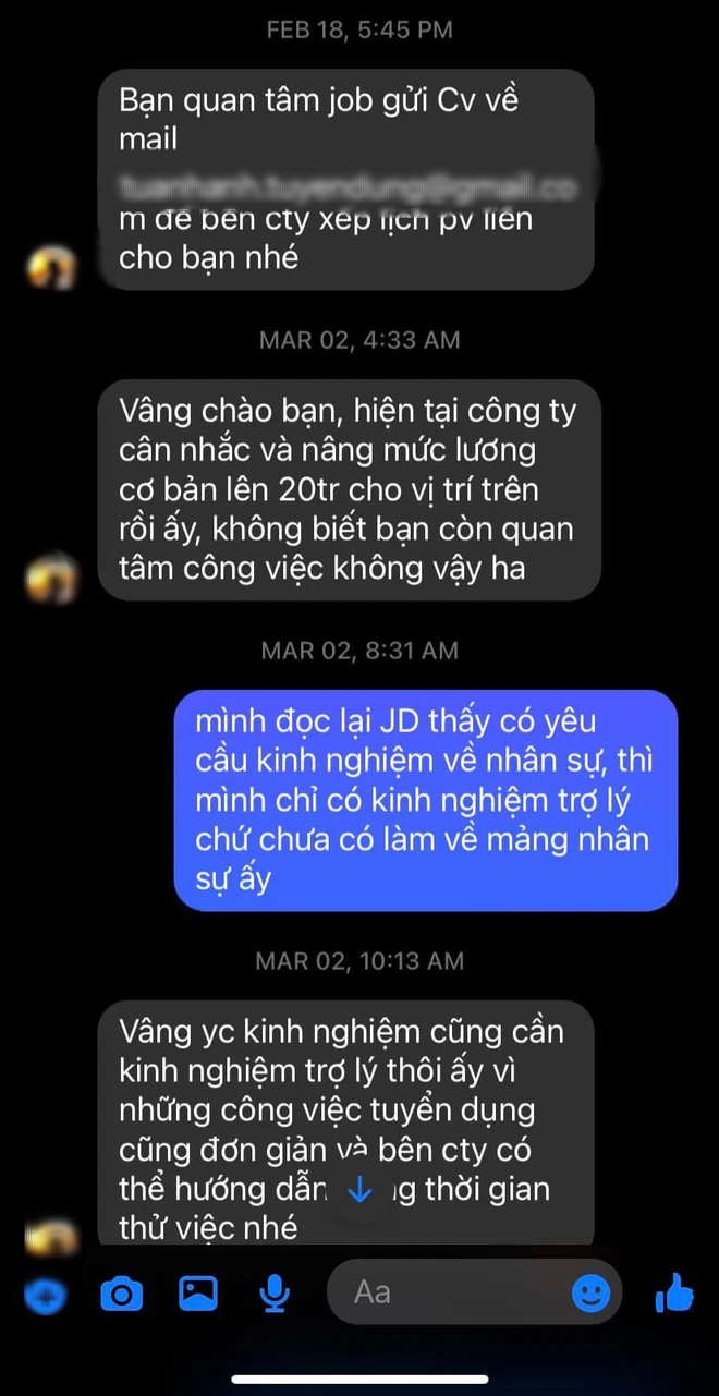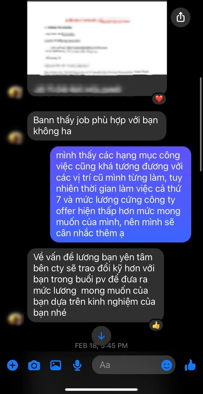 Theo đó, HR của công ty đã chủ động nhắn tin và gửi JD công việc của công ty cho T.H tham khảo, nhưng do thấy một số yêu cầu CV cũng như mức lương khác với mong muốn nên đã từ chối.
