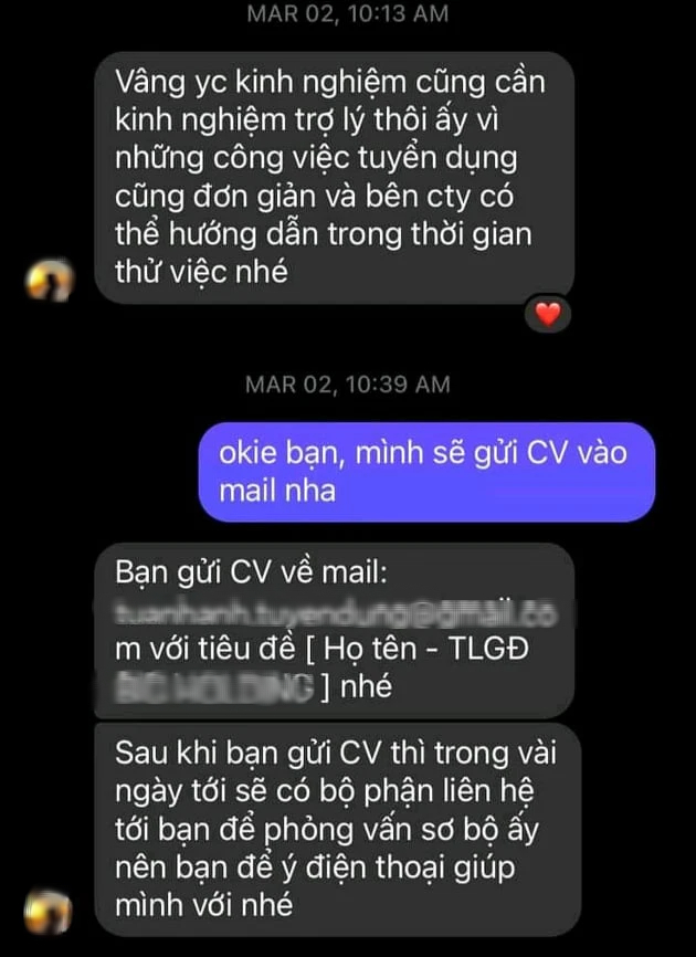 Nộp CV xong cô gái đã về nhà chờ, 3 tuần trôi qua cô gái không hề nhận được cuộc gọi nào từ bên tuyển dụng, nhưng lại nhận được tin nhắn 2 bạn HR khác của công ty mời gọi bạn ấy gửi CV vào công ty. Thời gian gần đây, cô gái lại nhận được tin nhắn bạn HR thứ 3 của bên công ty, cô gái phản hồi là đã gửi CV rồi thì bên công ty gọi điện trao đổi công việc.