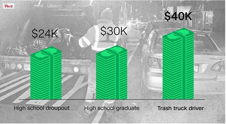 Với các ngành nghề khác, những người bỏ học khi đang học trung học phổ thông chỉ kiếm được khoảng 24.000 USD và những người đã tốt nghiệp trung học phổ thông có thu nhập cao hơn nhóm đối tượng bỏ học giữa chừng chỉ 6.000 USD.