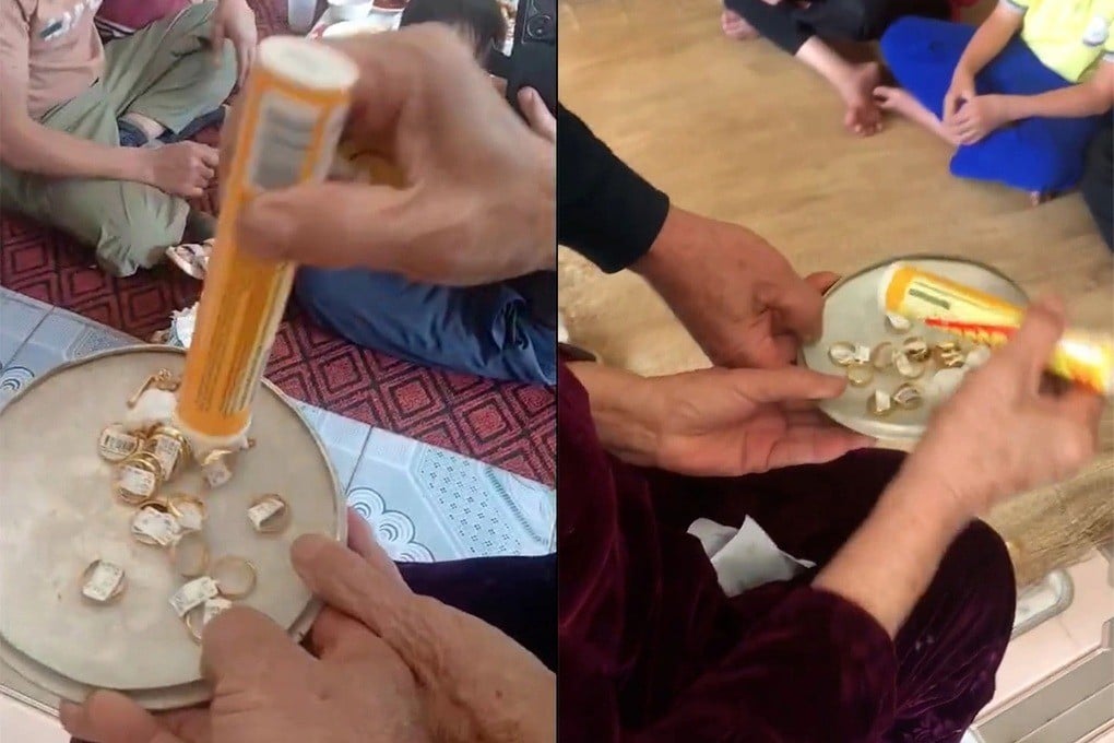 Trong clip, bà Cao Thị Dục (75 tuổi, xóm Trung Yên, xã Đông Hiếu, tỉnh Nghệ An) cẩn thận mở một hộp C sủi được bọc kín bằng nhiều lớp giấy và băng keo. Khi nắp ống vừa bật ra, hàng loạt trang sức bằng vàng như dây chuyền, nhẫn, bông tai lần lượt trút xuống chiếc đĩa đặt sẵn, khiến cả gia đình không khỏi sửng sốt.