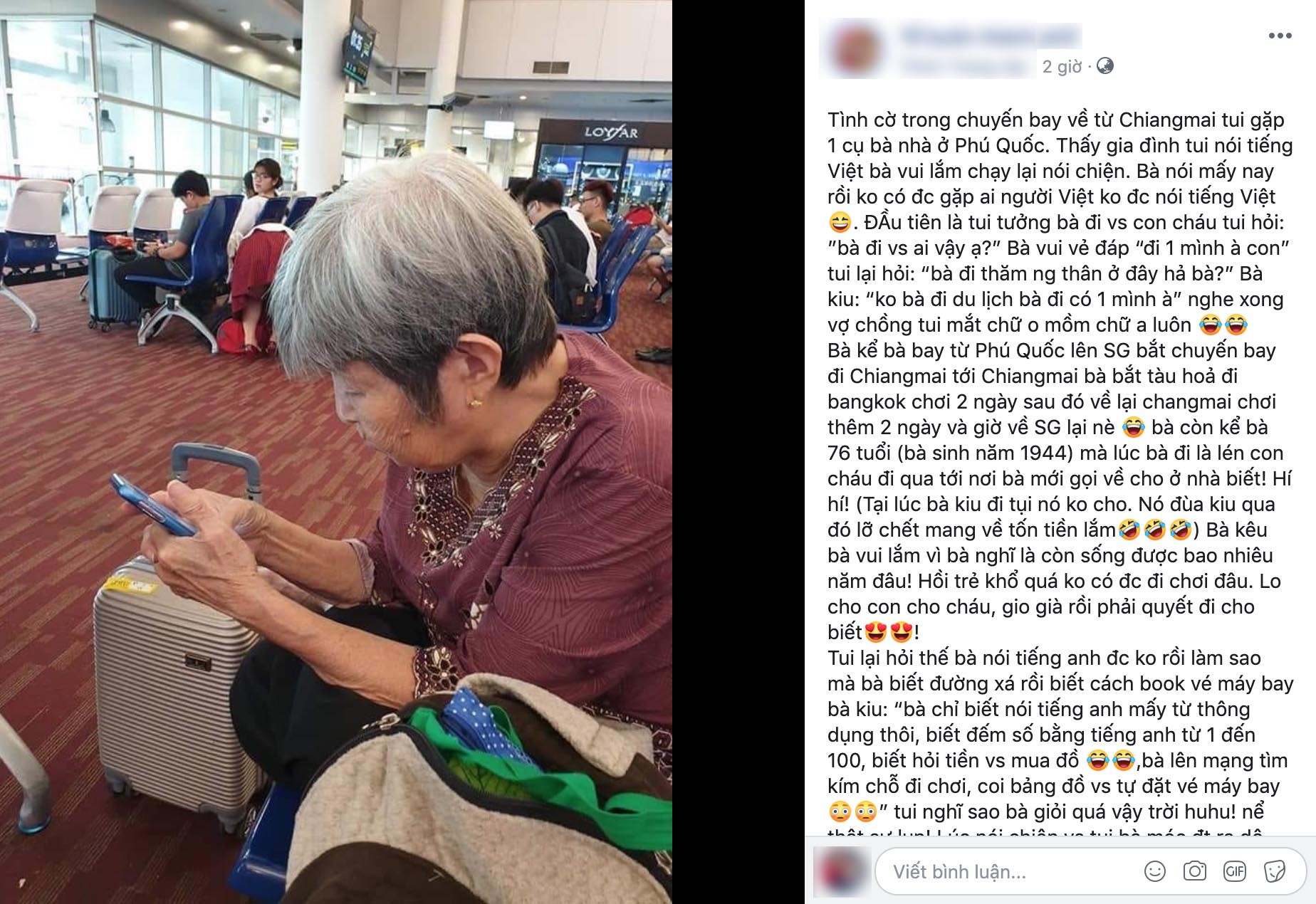 Cũng theo lời chị N.N, cụ bà không giỏi tiếng Anh, chỉ biết đếm từ 1 đến 100 và mấy từ thông dụng như hỏi giá tiền và mua đồ. Bà cũng tự lên mạng tìm chỗ đi chơi, coi bản đồ và tự đặt vé máy bay.