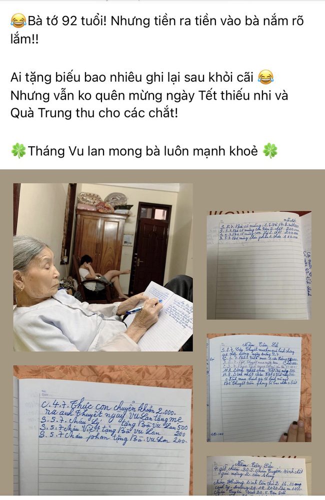 Trong bài đăng có chia sẻ, cụ bà năm nay đã 92 tuổi nhưng tiền ra tiền vào bà nắm rất rõ khiến mọi người phải ngỡ ngàng. Từng khoản một được bà ghi ra sách một cách cẩn thận.