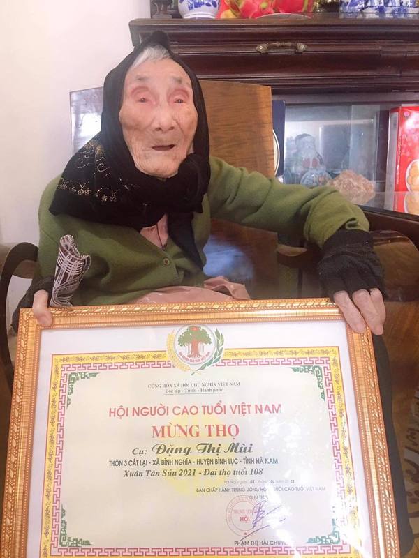 Theo những thông tin được chính chủ chia sẻ, cụ bà gây sốt có tên đầy đủ là Đặng Thị Mùi, hiện đang cư ngụ tại Hà Nam. Dịp Tết Tân Sửu này cũng là lúc cụ Mùi tròn 108 tuổi, cụ vừa nhận được thư chúc tết và mừng thọ của Hội người cao tuổi Việt Nam.
